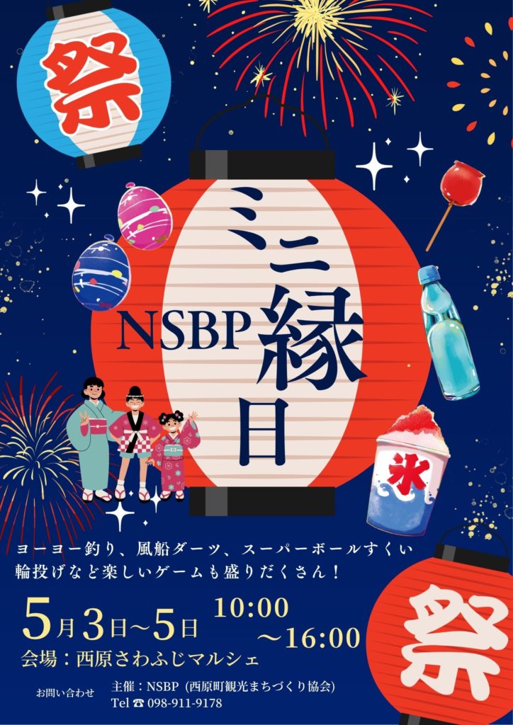 NSBP ミニ縁日 2026/04/28 期間 2026年5月3日(日)~5日(火) 日時:2026年5月3日(日)~5日(火)開催:10:00~16:00場所:西原さわふじマルシェ 2026/04/28 投稿ナビゲーション イベント 一覧に戻る 前のイベント あまくま市