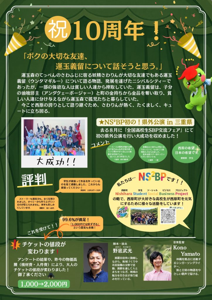 創作演劇「さわりんと運玉義留」チケット販売! 2026/02/13 2026/02/14 創作演劇「さわりんと運玉義留」西原町を愛する小中高生が演じる演劇が10周年を迎えました。涙あり笑いありの西原愛あふれる演劇となっております。是非ご覧ください。チケット販売場所・さわふじマルシェ(西原劇場内) 9時~18時 西原町字小波津480番地 西原町観光まちづくり協会 笹倉 090-8062-0450※現在観光まちづくり協会の電話が故障中なので連絡は携帯にお願いします。 2026/02/13 2026/02/14 投稿ナビゲーション ニュース 一覧に戻る 前のニュース 【重要】電話機不具合による臨時連絡先のお知らせ